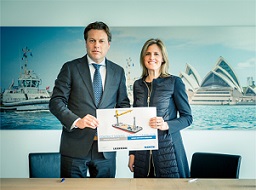 The partnership between Liebherr and Damen Shipyards Group began with the delivery of an offshore crane type BOS 300T in 1985. 22 years and 109 delivered Liebherr cranes later, the collaboration continues in the festive order signing ceremony of a floating crane type CBG 350 as 110th ordered unit. Both tradition-conscious businesses are successfully lead in the third generation by family members of the company founders. Mrs. Patricia Rüf and Mr. Arnout Damen signed the contract in the name of the two family-owned companies in the middle of March 2017. At the signing ceremony for the 110th order, Arnout Damen said: