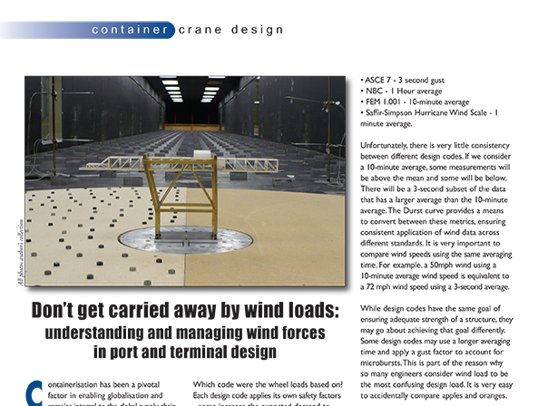 Understanding and managing wind forces in port and terminal design. Containerisation has been a pivotal factor in enabling globalisation and remains integral to the global supply chain. However, it can introduce complexity into the procurement process due to variations in regional design practices. Across the globe, environmental hazards such as wind loads, are still defined using region-specific methodologies. Even within a single region, cranes and wharves may be engineered according to separate design standards.